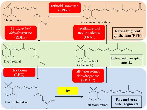 Retinoid dehydrogenases/reductases (oxidoreductases), including retinol dehydrogenase, catalyze the key oxidation-reduction reactions in the visual cycle, converting vitamin A to 11-cis retinal, which is the chromophore of the rod and cone photoreceptors. It is believed that RDHs at rod and cone are different, but related and can catalyze the same reaction. RDH12 is the primary enzyme that reduces all-trans retinal released from bleached photopigments during recovery phase in the visual cycle. The RDH12 enzyme can use either cis or trans retinoid isomers as substrates and can also function as both dehydrogenase (i.e. retinol to retinal) and reductase (i.e. retinal to retinol).[12][13]