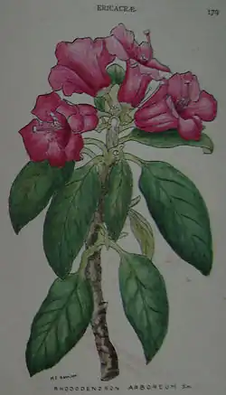 Rhododendron arboreum, the tree rhododendron,[1] is an evergreen shrub or small tree with a showy display of bright red flowers. It is found in Bhutan, China, India, Myanmar, Nepal, Sri Lanka, Pakistan and Thailand. It is the national flower of Nepal. In India it is the state tree of Uttarakhand and state flower of Nagaland.