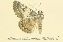 {{cite journal}}: CS1 maint: unfit URL (link) - ↑ Beccaloni, G.; Scoble, M.; Kitching, I.; Simonsen, T.; Robinson, G.; Pitkin, B.; Hine, A.; Lyal, C., eds. (2003). "Rhuma subaurata". The Global Lepidoptera Names Index. Natural History Museum. Retrieved 13 May 2018.