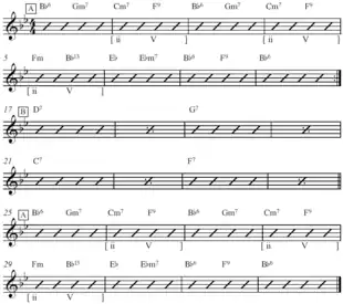 32-bar rhythm changes in B, as commonly used for improvisation (slashes indicate rhythm chordal instrument improvised comping)[1]