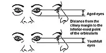 A facelift is performed to rejuvenate the appearance of the face. Aging of the face is most shown by a change in position of the deep anatomical structures, notably the platysma muscle, cheek fat and the orbicularis oculi muscle.[11] These lead up to three landmarks namely, an appearance of the jowl (a broken jaw line by ptosis of the platysma muscle), increased redundancy of the nasolabial fold (caused by a descent of cheek fat) and the increased distance from the ciliary margin to the inferior-most point of the orbicularis oculi muscle (caused by decreasing tone of the orbicularis oculi muscle).[11] The skin is a fourth component in the aging of the face. The ideal age for face-lifting is at age 50 or younger, as measured by patient satisfaction.[12][13][14] Some areas, such as the nasolabial folds or marionette lines, in some cases can be treated more suitably with Botox or liposculpture.