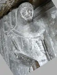 Sir Richard was also buried in Exeter Cathedral, near his brother the bishop, against the north wall across the north ambulatory from the bishop's tomb. His tomb is marked by an elaborate monument comprising a recessed ogee shaped niche set into the wall, containing his recumbent effigy, in the form of a cross-legged knight, which style supposedly represents crusaders. At the effigy's head stands a small statue of a man and at the feet a horse with an even smaller statue of a man holding its reins. According to Prince (d. 1723)[17] this last group refers to the tradition of the cripple who seised the foreleg of Sir Richard's horse at Cripplegate and thereby threw him off his horse into the hands of the murderous mob. It is however more likely that the figures are "a touching early fourteenth century visual representation of the Knight with his immediate following ... a knight is shown accompanied by his squire, page and horse".[18] The Devon historian Sir William Pole (d. 1635) stated that the arms of Stapledon (Argent, two bends wavy sable) were displayed on the shield of the effigy,[19] but today no trace of colour remains. These arms are however still visible (possibly restored) on the nearby monument to his brother the bishop.