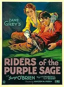 Riders of the Purple Sage is a 1931 American pre-Code Western film based upon the 1912 novel by Zane Grey, directed by Hamilton MacFadden, photographed by George Schneiderman, and starring George O'Brien and Marguerite Churchill.[1] The picture was released by the Fox Film Corporation with a running time of 58 minutes and remains the third of five screen versions. It was the first sound version.[1] The movie was followed later the same year by a similar adaptation of the novel's sequel, The Rainbow Trail, also starring O'Brien.