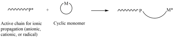 In polymer chemistry, ring-opening polymerization (ROP) is a form of chain-growth polymerization in which the terminus of a polymer chain attacks cyclic monomers to form a longer polymer (see figure). The reactive center can be radical, anionic or cationic. Some cyclic monomers such as norbornene or cyclooctadiene can be polymerized to high molecular weight polymers by using metal catalysts. ROP is a versatile method for the synthesis of biopolymers.