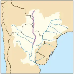 The Paraguay River (Ysyry Paraguái in Guarani, Rio Paraguai in Portuguese, Río Paraguay in Spanish) is a major river in south-central South America, running through Brazil, Bolivia, Paraguay and Argentina. It flows about 2,695 kilometres (1,675 mi)[2] from its headwaters in the Brazilian state of Mato Grosso to its confluence with the Paraná River north of Corrientes and Resistencia.