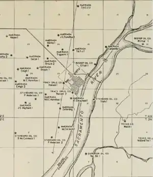 Development of the field picked up rapidly during the Second World War. Since oil tankers were being appropriated in the San Francisco Bay Area for use in the war effort, a giant gas pipeline from the Kettleman Hills field had to be converted to an oil pipeline, creating an immediate need for a gas supply closer to the urban center.[14] The timing was perfect, as the Rio Vista field was proving to be enormous as each new well came in, and by the end of November, 1944, there were 70 active gas wells in the new field.[15] Peak production was the next year, with over 160 billion cubic feet (4.5×109 m3) of gas being withdrawn from the field in 1945.[16]