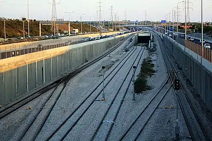In 2005, works began on the construction of Route 431, a limited-access freeway connecting Rishon LeZion with Modi'in.[5] Traffic lanes were built on either side of both the Be'er Ya'akov–Rishon LeZion and Anava–Modi'in railways, incorporating the existing rail tracks into the new highway median, in a manner similar to Ayalon freeway-railway in central Tel Aviv. The highway was additionally designed to accommodate a dual-track railroad in its median for much of its length, guaranteeing right-of-way to extend and connect these two sections and thus creating the potential for a new contiguous Rishon LeZion–Modi'in corridor.