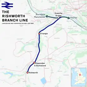 The Rishworth branch was built in the Ryburn valley by the Lancashire and Yorkshire Railway and linked Sowerby Bridge with Rishworth and served the villages of Triangle, Ripponden, Barkisland and Rishworth.[1]