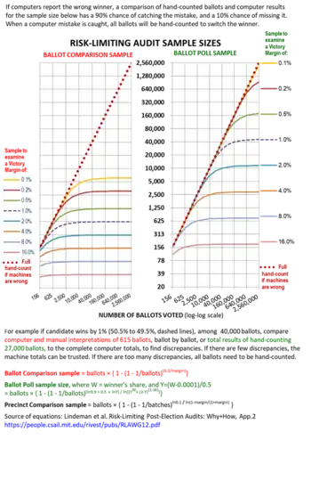 - Auditing a large enough random sample of ballots so the chance of missing mistakes is acceptably low.