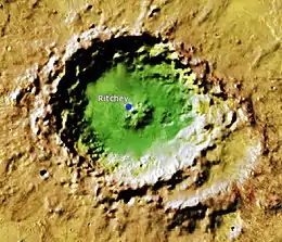 Ritchey is a crater on Mars, located in the Coprates quadrangle at 28.8° South and 51° West. It measures 79 kilometers in diameter and was named after George W. Ritchey, an American astronomer (1864–1945).[1] Ritchey lies south of Valles Marineris and north of Argyre Planitia, a large impact crater.[2] There is strong evidence that it was once a lake.[3][4]