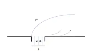 In the near-field the momentum of the plume is larger than its buoyancy. This balance is represented in the (dimensionless) Froude number, and is larger than one in the near-field, indicating supercritical flow. Both the liftoff point and the outer boundary of the near-field, the plume front, are characterized by critical flow conditions () and the flow in the near-field region shows features similar to a jet.[8] The momentum balance is dominated by barotropic and baroclinic pressure gradients, turbulent shear stresses and flow acceleration. Flow deceleration is mainly caused by the shear stresses on the interface of the plume with the ambient ocean. In some cases a near-field region will not exist. This is for example the case if the width of the river mouth is large relative to the Rossby radius of deformation, , and the fresh water inflow will leave the river mouth as a far-field plume. When tides are large the near-field plume is also known as the tidal plume.[9]