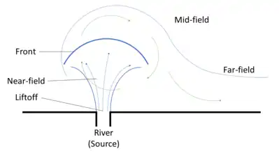 In case of strong riverine forcing, often with large estuarine Richardson number, the front of the plume separates from the bottom. The position at which this flow separation occurs is called the liftoff point and sets the landward edge of the near-field. This point is important in surface-advected river plumes.[6][7]