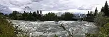 The Spokane River and Spokane Falls are the main natural attraction of Riverfront Park and are visible from many areas of the park. Along the river's calm south channel, many of the walking paths and lawns go right up to the river's edge, allowing park-goers to get close to the water. People have been known to stick their feet in the water[84] and fish in the south channel from time to time.[85][86][87] Access and visibility to the river's north channel, which is home to the falls, is generally more limited due to the faster and rougher water and river gorge that is created by the falls. However, many official viewing points exist, most notably two pedestrian suspension bridges at the west end of snxw meneɂ that provide up-close viewing of the falls.[88]