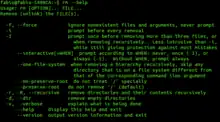 • -f, "force," which ignores non-existent files and overrides any confirmation prompts (effectively canceling -i), although it will not remove files from a directory if the directory is write-protected.