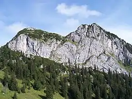 The Roß- und Buchstein (1,701 m) is a mountain of the Tegernsee Mountains range, in the Bavarian Prealps, Bavaria, Germany. The Tegernsee cabin (German: Tegernseer Hütte) is lodged between the Roßstein and the Buchstein.