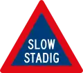 A white background signifies the sign is permanent, while a yellow background signifies that the sign is temporary. Warning signs are an upwards-pointing red triangle and contain a black pictogram describing the danger or obstruction. Speed limit signs are a red circle with the limitation in black. South Africa drives on the left.
