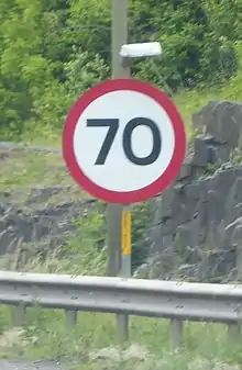Variable speed limits are used on some major traffic roads. These can be changed in response to weather, traffic levels, time of day or for other reasons with the currently applicable speed limit displayed using an electronic road sign. Signs with the speed shown in a red circle are compulsory, signs where the speed is not within a red circle are advisory and exceeding these speeds while driving safely within the applicable national speed limit is not in itself an offence.[14] Variable speed limits were introduced on some congested major routes as an element of controlled motorway techniques to improve traffic flows for given prevailing conditions.[15] Part-time variable speed limits may also be used outside schools.