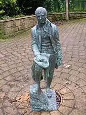 The gardens of Eglinton Country Park, established by the Clement Wilson Foundation, were graced by a fine Belgian 2' 6" statue of Burns, presented by Mr R Clement Wilson.[45] The statue for many years had stood on a cairn between the old bowling green and the rhododendron maze; however, in 2009, it was moved to the Eglinton Country Park Visitor's Centre area for security reasons and to a site where more of the public will be able to appreciate it. It was stolen some years ago and on that occasion it was found unceremoniously dumped in the River Garnock.[46]