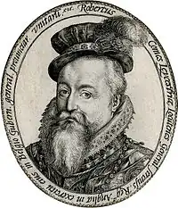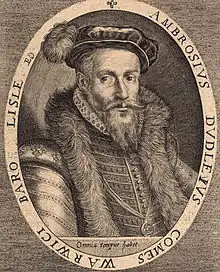 Robert Dudley was the fifth son of John Dudley, 1st Duke of Northumberland, and his wife Jane, daughter of Sir Edward Guildford.[6] His paternal grandfather, Edmund Dudley, had been an adviser to King Henry VII and was executed for treason in 1510 by King Henry VIII. John and Jane Dudley had 13 children in all and were known for their happy family life.[7] Among the siblings' tutors figured John Dee,[8] Thomas Wilson, and Roger Ascham.[9]