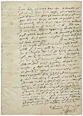 Retiring to his house at Kew, away from court as from the putative crime scene, he pressed for an impartial inquiry which had already begun in the form of an inquest.[45] The jury found that it was an accident: Lady Dudley, staying alone "in a certain chamber", had fallen down the adjoining stairs, sustaining two head injuries and breaking her neck.[46] It was widely suspected that Dudley had arranged his wife's death to be able to marry the Queen. The scandal played into the hands of nobles and politicians who desperately tried to prevent Elizabeth from marrying him.[47] Most historians have considered murder to be unlikely.[48] The coroner's report came to light in The National Archives in 2008 and is compatible with an accidental fall as well as suicide or other violence.[49] In the absence of the forensic findings of 1560, it was often assumed that a simple accident could not be the explanation[50]—on the basis of near-contemporary tales that Amy Dudley was found at the bottom of a short flight of stairs with a broken neck, her headdress still standing undisturbed "upon her head",[51] a detail that first appeared as a satirical remark in the libel Leicester's Commonwealth of 1584 and has ever since been repeated for a fact.[52] To account for such oddities and evidence that she was ill, it was suggested in 1956 by Ian Aird, a professor of surgery, that Amy Dudley might have suffered from breast cancer, which through metastatic cancerous deposits in the spine, could have caused her neck to break under only limited strain, such as a short fall or even just coming down the stairs.[51] This explanation has been widely accepted.[48] Suicide has also often been considered an option, motives being Amy Dudley's depression or mortal illness.[53]