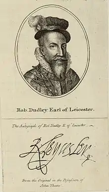Robert Dudley, 1st Earl of Leicester, KG, PC (24 June 1532[note 1] – 4 September 1588) was an English statesman and the favourite of Elizabeth I from her accession until his death. He was a suitor for the queen's hand for many years.[1][2]