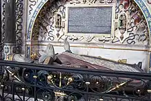 Leicester's private life interfered with his court career and vice versa. When his first wife, Amy Robsart, fell down a flight of stairs and died in 1560, he was free to marry the queen. However, the resulting scandal very much reduced his chances in this respect. Popular rumours that he had arranged for his wife's death continued throughout his life, despite the coroner's jury's verdict of accident. For 18 years he did not remarry for Queen Elizabeth's sake and when he finally did, his new wife, Lettice Knollys, was permanently banished from court. This and the death of his only legitimate son and heir were heavy blows.[4] Shortly after the child's death in 1584, a virulent libel known as Leicester's Commonwealth was circulated in England. It laid the foundation of a literary and historiographical tradition that often depicted Leicester as the Machiavellian "master courtier"[5] and as a deplorable figure around Elizabeth I. More recent research has led to a reassessment of his place in Elizabethan government and society.