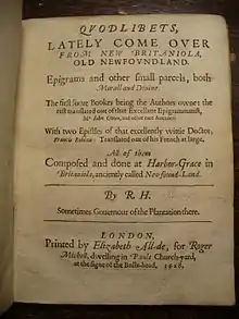 10. 'Qvodlibets, lately come over from New Britaniola, old New-found-land. Epigrams and other small parcels, both morall and diuine. The first foure bookes being the authors owne: the rest translated out of that excellent epigrammatist, Mr. Iohn Owen, and other rare authors: With two epistles of that excellently wittie doctor, Francis Rablais: translated out of his French at large. All of them composed and done at Harbor-Grace in Britaniola, anciently called Newfound-Land.' (1628)