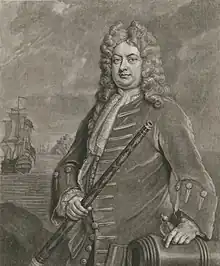 Robert Hughes was born in the late seventeenth century. He was the brother of Royal Navy officer Captain Richard Hughes, and as such was the uncle of Captain Sir Richard Hughes, 1st Baronet.[1] Hughes also joined the navy and, with the Nine Years' War ongoing, was promoted to lieutenant on 19 December 1692.[2] The following year he was appointed second lieutenant of the 70-gun ship of the line HMS Suffolk. Hughes' early career is not well recorded, but by 1695 he was serving as the first lieutenant of the 100-gun ship of the line HMS Queen, which was the flagship of Admiral Sir Cloudesley Shovell. Sometime after this Hughes was promoted to commander before, on 28 June 1697, being advanced in rank to captain.[3]
