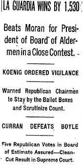 In 1919, Moran was chosen by Tammany Hall to run as the Democratic candidate to succeed himself as president of the Board of Aldermen in the November election.[2] Moran's republican opponent was United States Congressman and former Deputy New York Attorney General Fiorello H. LaGuardia.[4] Michael "Dynamite Mike" Kelly, the popular commander of New York's Third "Shamrock" Battalion, also joined the race on the ticket of the Liberty Party.[15] Kelly was a war hero and recipient of the Distinguished Service Cross and Croix de Guerre. His campaign was supported by the notorious Jeremiah A. O'Leary and a small group of Irish Americans who opposed the League of Nations and advocated recognition of the Irish Republic. Tammany looked with alarm upon Kelly's entrance into the campaign and tried to persuade him to withdraw his candidacy and throw his support behind Moran. When he refused, the Tammany chiefs went to the New York Supreme Court to remove Kelly's name from the ballot, pointing out that 547 of the 3,491 signatories to Kelly's nomination petition had failed to register or otherwise comply with election laws. The Supreme Court agreed and ordered that Kelly's name be stricken from the ballot, a ruling later upheld by the Appellate Division.[4]