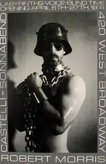 In 1974, Robert Morris advertised his display at the Castelli Gallery with a poster showing him bare-chested in sadomasochistic garb. Critic Amelia Jones argued that the body poster was a statement about hyper-masculinity and the stereotypical idea that masculinity equated to homophobia.[15] Through the poster, Morris equated the power of art with that of a physical force, specifically violence.[16]