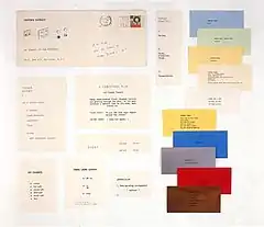 "Similar ideas were at work in Yam Festival which George Brecht and I carried out last year. In effect this was a mailing to an audience, sometimes randomly chosen, of an assortment of things. Some were event cards similar to the above; others were objects, food, pencils, soap, photos, actions, words, facts, statements, declarations, puzzles, etc. Certain ones were by subscription. One might say this way of working is a way or manner of calling attention to what one wishes to talk about; or it is a way of talking about it. Or it is a way to hold up for scrutiny a range of material that ordinarily is not so directly useful for art or has not yet been so considered." Robert Watts, quoted in the Times Literary Supplement, 1964[8]