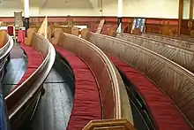 The building is constructed of coursed ragstone with ashlar and probably terracotta dressings. The doors are made of Oak on both the Cambridge Road and Robertson Street aspects. The Robertson Street entrance has steps carved out of York Stone.[17] A monumental staircase extends up from the Robertson Street entrance after passing a hall which is currently used as a cafeteria. A rear stair and stairs with wrought iron balustrades lead into the horseshoe shaped gallery which repeats the curved pews with under-pew heating.[1] In total there was seating for 1100 people.[3]