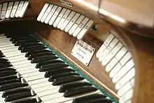 The church features a Forster and Andrews two console organ with highly ornamented pipes mounted unusually above the altar behind the minister.[17] It was later overhauled by Morgan and Smith. Some pipes are currently stored laying down due to deterioration in the mountings and other stops are believed to be inoperable.[18]