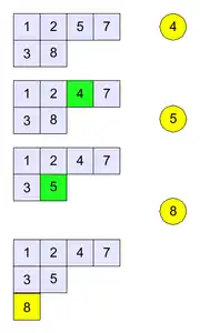 The fact that T ← x has increasing rows and columns, if the same holds for T, is not obvious from this procedure (entries in the same column are never even compared). It can however be seen as follows. At all times except immediately after step 4, the square (i, j) is either empty in T or holds a value greater than x; step 5 re-establishes this property because (i, j) now is the square immediately below the one that originally contained x in T. Thus the effect of the replacement in step 4 on the value Ti, j is to make it smaller; in particular it cannot become greater than its right or lower neighbours. On the other hand the new value is not less than its left neighbour (if present) either, as is ensured by the comparison that just made step 2 terminate. Finally to see that the new value is larger than its upper neighbour Ti−1, j if present, observe that Ti−1, j holds after step 5, and that decreasing j in step 2 only decreases the corresponding value Ti−1, j.