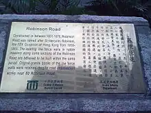 Robinson Road is a thoroughfare located in Mid-Levels, Hong Kong Island, Hong Kong. To the east, it intersects with Magazine Gap Road and Garden Road, while to the west, it connects with Babington Path and Park Road.