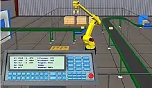 RoboLogix is a robotics simulator which uses a physics engine to emulate robotics applications.[1] The advantages of using robotics simulation tools such as RoboLogix are that they save time in the design of robotics applications and they can also increase the level of safety associated with robotic equipment since various "what if" scenarios can be tried and tested before the system is activated.[2] RoboLogix provides a platform to teach, test, run, and debug programs that have been written using a five-axis industrial robot in a range of applications and functions. These applications include pick-and-place, palletizing, welding, and painting.