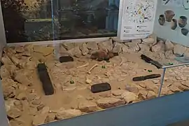 - Burial Chamber 133 : Paved with cobbles, this burial chamber contained preserved fragments of ceramics, a stone axe in the floor, shards of pots, the skeleton of a newborn, pearls of steatite (a black rock) and white marble and flint flakes.[7][12]