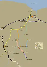 Heading south from the Chili Avenue grade crossing, the first notable area of trackage is the Brooks Avenue yard. Continuing south, the RSR interchanges with CSX at Genesee Junction, where there are three online customers served by the RSR.[2] 12 miles farther down, the Rochester and Southern passes through P&L Junction, its connection point with the GNWR. The line then continues south to Silver Springs, where the RSR interchanges with the Southern Tier Line in the heart of Silver Springs.