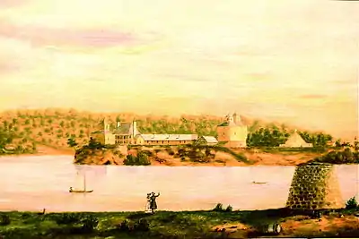Rock Island in the pre-arsenal years, following the Black Hawk War of 1832 with a view of the U.S. Army post Fort Armstrong, circa 1839