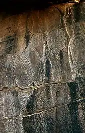 3. Engravings of sub-naturalistic style or decadent hartebeest stage. These are characterized by the mediocrity of their style and technique, reduced to a fairly clumsy dotting and an irregular final polishing. Their patina is clearer than for the two preceding stages, an observation confirmed by the fact that they are often found on the same murals. Their dimensions are more reduced than the first group, but larger than those of the second, with which they have nothing in common. The most common theme is of sexually displayed human figures, in a semi-crouching position, seen frontally, often together with numerous lions and ostriches. The fauna, less varied than in the two first groups, still includes the last representations of hartebeest of which the horns are not always ringed, and images of elephants, cattle and panthers. The association of man-ram disappears, which seems "to mark a rupture on the environment of the foregoing stages and shows an evolution of religious beliefs", replaced by the man-lion association, hartebeest and elephants no longer holding the place which they had formerly occupied. It is, according to Lhote, "the end, very degraded, of that remarkable artistic epoch of the south Oranian.[2]: 174