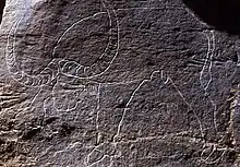 1. Large engravings of monumental naturalistic style, or Large-scale Hartebeest style. Beside the great hartebeest, elephants and rhinoceros, Lhote placed the numerous ostriches and antelopes, boars, lions and panthers. The animals are represented absolutely in profile apart from the hartebeest, in relative profile (the two-eyed formula being frequent). Lhote placed in this ensemble the human images which accompany them (of which the hands and feet have almost always six digits). No human figure with animal head having been found, he observed that "the hartebeest ensembles of the Saharan Atlas differ from those of Tassili-n-Ajjer and of Fezzan where these figures are running.[2]: 197 The author also thinks that the domestication of the dog was achieved in this period and that the South Oranian presents the most ancient rock testimonies to it. This first stage also includes the "mythic animals". All these engravings are made by a punctuation of little dots or hollows, more or less connected, and then most often by a polishing apparently helped by a wooden utensil with the addition of wet sand. Some engravings show a beginning of polishing in the endoperigraphic area (head), others a complete polishing.