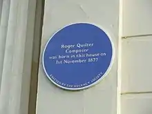 Quilter was born in Hove, Sussex;[1] a commemorative blue plaque is on the house at 4 Brunswick Square.[2] He was a younger son of Sir William Quilter, 1st Baronet, a wealthy noted landowner, politician and art collector.