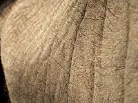 Bats rely on skin on their wings to generate lift and thrust used in flight. Therefore, the structure of the bat wing skin is different from the skin of the bat body. Bat wing skin consists of two thin layers of epidermis with a thin layer of dermis/hypodermis located between the epidermal layers whereas the skin of the bat body consists of a single layer of epidermis with a thicker layer of dermis internal to the epidermis. Within the dermal and epidermal layer of bat wing skin, the connective tissue and muscle fibers provide the structural support. The connective tissue fibers within bat wing skin consists of collagen and elastin fiber bundles arranged in a "regular mesh like scaffolding",[13] which the nerves, skeletal muscle fibers and blood vessels embed themselves into. Of the muscles that insert themselves into the mesh scaffolding, larger muscles anchor the skin to the bone and control the membrane tension and camber of the bat wing during flight,[14] whereas smaller muscles, which originate from within the mesh scaffolding, attach to collagen fibers within the fiber network and modulate bone loading and allow for precise control of wing shape and tension.[14] As seen in snakes, local structural differences within the arrangement of the fibers change the mechanical properties of local area, but there are general characteristics that describe the mechanical behavior of bat wing skin. Within the mesh scaffolding of bat wing skin, collagen fibers cross bones perpendicular to the long axes of the bones, therefore mechanical properties of bat wing skin oriented perpendicular to the long axes of the bones exhibit a lower stiffness than the skin that is oriented parallel to the long axes of the bodies. Stiffer skin is necessary for bat wing skin oriented in the direction parallel to the long axes of the bones to prevent too much deformation of bat wing skin during flight (with respect to the bone), resulting in the shearing of the bat wing skin off of the bone. Flexible skin is necessary for the direction perpendicular to the long axes of the bones for facilitating the shape changes needed for movement and control during flight.[14] This anisotropy of bat wing skin is also useful as method of storing and releasing elastic energy, particularly during the downstroke.[14] During the downstroke, the bat extends its wing and the wing skin experiences an aerodynamic force. The wing skin expands and counteracts the aerodynamic force. After the wing is fully extended, the orientation of the wing is nearly vertical and the aerodynamic forces on the wing are reduced. As the aerodynamic force is reduced, the wing recoils, drawing the digits of the wings together in preparation for the upstroke.