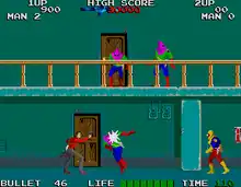 Rolling Thunder[lower-alpha 1] is a run and gun video game developed by Namco in Japan and Europe and released in 1986 as a coin-operated arcade video game using the Namco System 86 hardware. It was distributed in North America by Atari Games. The player takes control of a secret agent who must rescue his female partner from a terrorist organization. Rolling Thunder was a commercial success in arcades, and it was released for various home computer platforms in 1987 and the Nintendo Entertainment System in 1989. The original arcade game has been included in various classic game compilations as well. It influenced later arcade action franchises such as Shinobi and Time Crisis, which borrowed mechanics such as taking cover behind crates.
