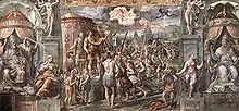 This falsified version of Constantine's baptism has found its way into a great deal of ecclesiastical art.[12] Depictions include the Stavelot Triptych (c. 1165), frescoes in I Santi Quattro Coronati, stained glass in the St Michael and All Angels' Church, Ashton-under-Lyne, and—most famously—Raphael's The Baptism of Constantine in the Raphael Rooms of the Apostolic Palace.[12]