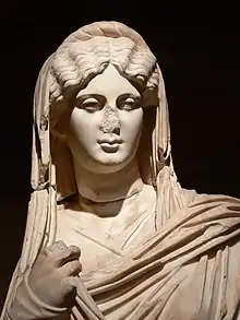 Julia Domna, wife of Septimius Severus, had a particularly notable hairstyle. Julia Domna was the wig's most influential patron. She wore a heavy, globular wig with simple finger-sized waves with a simple center parting. Julia Domna was the daughter of a high-ranking priest from Syria, and it has been suggested that her style was indicative of her foreign origins.[51] Despite being from the East, she adopted a wig to project a familiar Roman guise and particularly in order to imitate her predecessor, Faustina the Younger.[52] In 2012 Janet Stephens's video Julia Domna: Forensic Hairdressing, a recreation of a later hairstyle of the Roman empress, was presented at the Archaeological Institute of America’s annual meeting in Philadelphia. Foreign women often wore their hair differently from Roman women, and women from Palmyra typically wore their hair waved in a simple center-parting, accompanied by diadems and turbans according to local customs. Women from the East were not known to commonly wear wigs, preferring to create elaborate hairstyles from their own hair instead.[52] As time progressed, Severan hairstyles switched from the finger-waved center parting style, to one with more curls and ringlets at the front and back of the head, often accompanied by a wig.[53]
