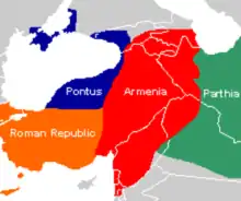 Contacts between the Italian peninsula and the Armenian Highland go back to the Iron Age when the Etruscan civilization traded with the Kingdom of Urartu by way of Phrygia and Ancient Greece. Urartian bronzes; bull-headed cauldrons and pottery were excavated in various parts of Etruscan Italy, particularly in Tuscany.[1] The Roman Republic played a pivotal role in the re-establishment of the Kingdom of Armenia in 189 BC. Antiochus III the Great was defeated at the Battle of Magnesia by the Romans which in turn allowed the Armenian strategoi of Antiochus, Artaxias and Zariadres to take control of an independent Armenian Kingdom. The Romans perceiving themselves as the legitimate successors of the Seleucids began to play a more aggressive role in the affairs of the Hellenistic world of Asia Minor starting with the acquisition of Pergamum in 133 BC. The Third Mithridatic War (75– 65 BC ) led Roman forces for the first time directly to the Armenian border. From that point on until the demise of the Kingdom of Armenia in 428, Rome played a significant role in the affairs of Armenia and Armenians. This article explores the history of that relationship, a relationship which alternated between harmony and conflict.
