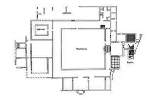 The original nucleus perhaps dating to the 1st-2nd century AD was the subject of successive renovations, expansions and modifications during the 3rd, 4th and 5th centuries AD.[13] It consists of two contiguous areas, with independent entrances and different construction and dimensional features. The Small Baths (rooms 27, 28, 32, 40, 41, 43, 44) to the north-west of the Large Baths appear to be later and intended as an alternative or replacement, perhaps due to technical problems or to their considerable size and reduced use.