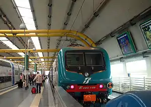 Electrification with overhead line at 3000 V DC was activated on 14 November 1938.[8] Goods traffic began to decline from the 1960s, due to the decline of the Fiumicino river port.[7] In 1990,[7] rail traffic ended on the link to the river port, but it was another ten years before it was closed.[6] However, the line began to assume a certain importance for passenger traffic with the opening of Fiumicino Airport. A study was carried out in September 1960[6] into the possible doubling of the line and the building of a branch from Porto station running directly to the airport.[7][9] The project was initially shelved, but it was resumed in the mid-eighties. A variation was built that branches off a few metres before the entry to Porto station, running entirely on a viaduct to a station called Fiumicino Aeroporto.