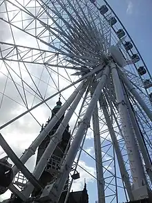 One of the most famous and well-travelled Bussink R60 wheels is the 60-metre (197 ft)[9][10] tall Roue de Paris, originally installed on the Place de la Concorde in Paris for the 2000 millennium celebrations. Roue de Paris left France in 2002 and in 2003-2004 operated in Birmingham and Manchester, England. In 2005 it visited first Geleen then Amsterdam, Netherlands, before returning to England to operate at Gateshead. In 2006 it was erected at the Suan Lum Night Bazaar in Bangkok, Thailand, and by 2008 had made its way to Antwerp, Belgium.[11] Roue de Paris uses 40,000 litres (8,800 imperial gallons) of water ballast to provide a stable base. It weighs 365 tonnes (402 short tons), and can be erected in 72 hours and dismantled in 60 hours by a specialist team. Transport requires seven 20-foot container lorries, ten open trailer lorries, and one closed trailer lorry. Its 42 passenger cars be loaded either 3 or 6 at a time, and each car can carry 8 people.[9]